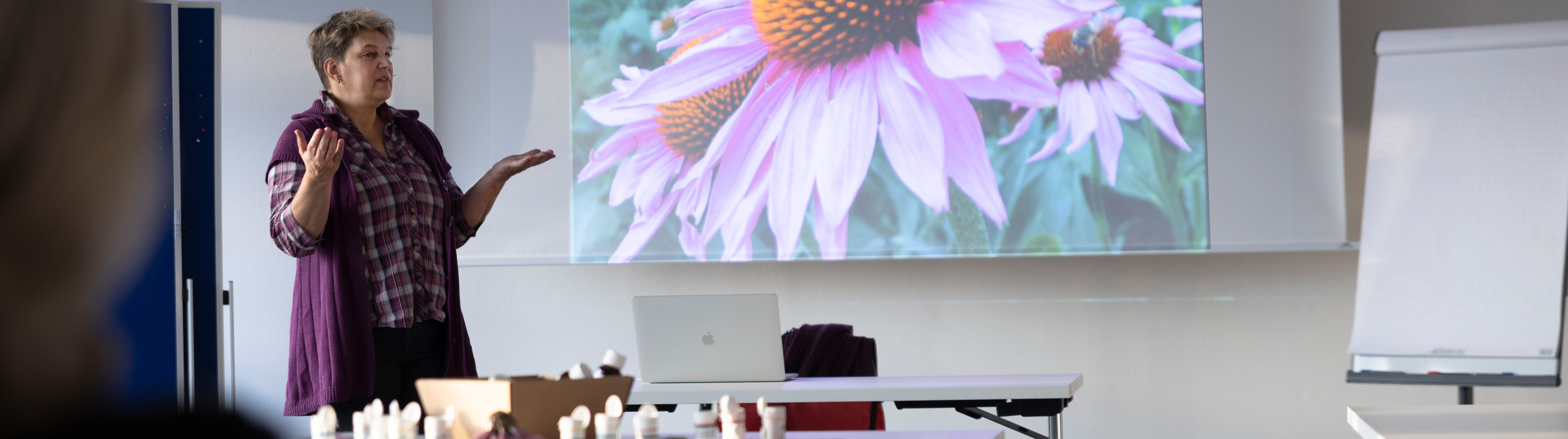 Elke Peter erläuterte in ihrem Vortrag im Rahmen der Gesundheits-wochen bei MEKRA Lang in Ergersheim die einzelnen Produktionsschritte bis hin zum fertigen Echinacea-Saft. Aber auch Pulver kann aus der Pflanze gewonnen werden.