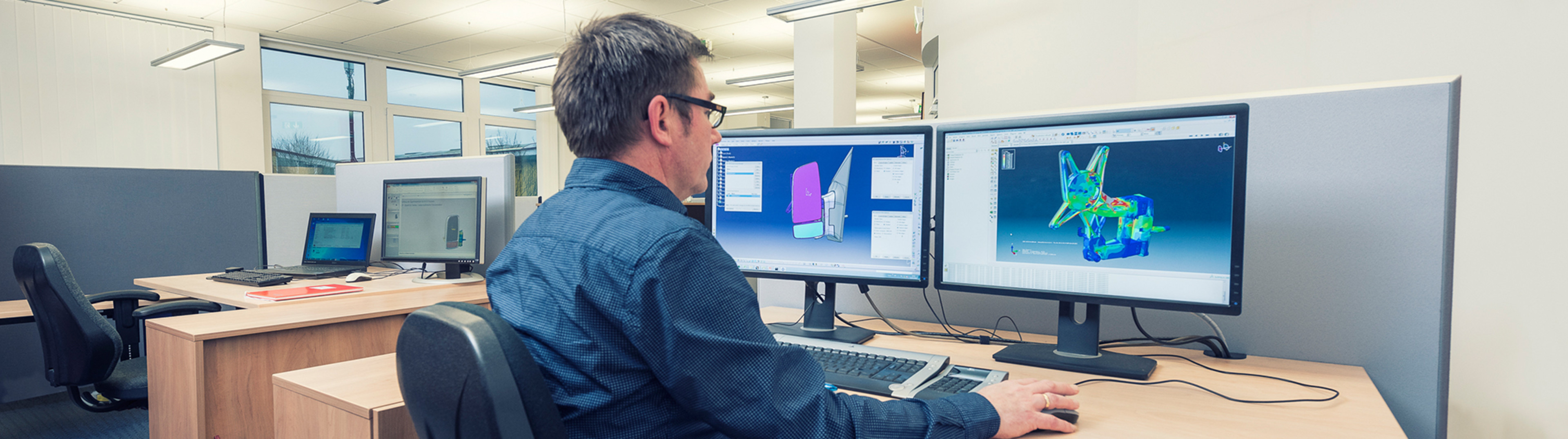 Alle neu entwickelten Kunststoffteile simulieren wir vor Produktion grundsätzlich mit der Spritzguss-Simulations-Software Moldflow. Mit Moldflow ahmen wir das Füllverhalten von Kunststoffteilen nach, prüfen, ob die Wandstärken kunststoffgerecht sind und berechnen den bestmöglichen Anspritzpunkt – er ist für die Bauteil-Qualität ausschlaggebend. Lässt sich ein verbleibender Verzug des Bauteils zunächst trotz erster planerischer Optimierung nicht beheben, so gestalten wir das Bauteil entgegen dem berechneten Verzug, um schließlich ein optimales Teil zu bekommen.
